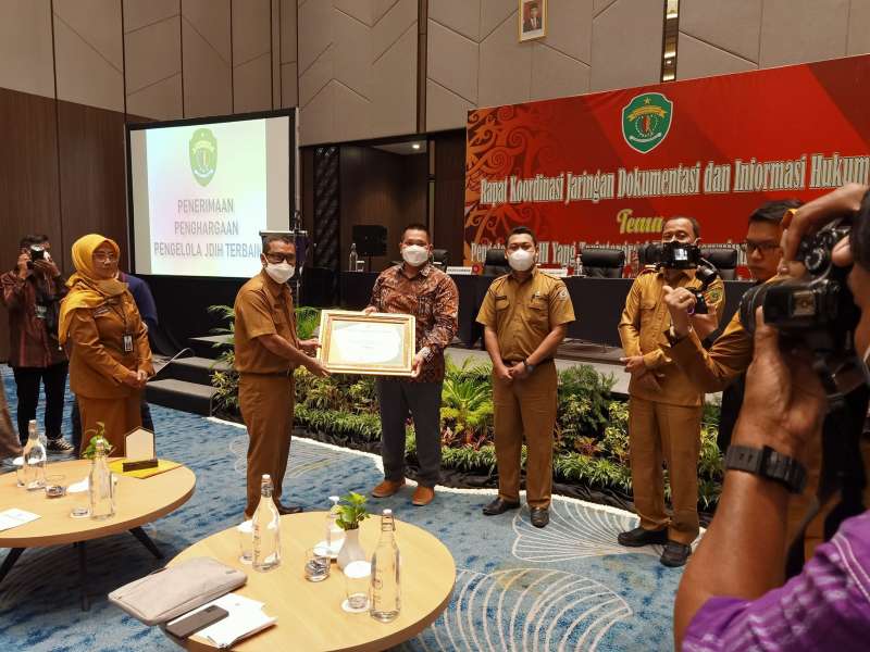 SAMARINDA - Pelaksanaan Rakor JDIH pada dilaksanakan di Hotel Mercure Samarinda pada Selasa, 24 Mei 2022. Rapat Koordinasi ini dihadiri oleh Bagian Hukum Sekretariat Daerah Kabupaten/Kota se-Kalimantan Timur, Dinas Komunikasi dan Informatika Kabupaten/Kota se-Kalimantan Timur, dan Sekretariat Dewan Kabupaten/Kota se-Kalimantan Timur. Tema yang diangkat dalam pelaksanaan Rakor Tahun 2022 ini yaitu "Pengelolaan JDIH yang Terintegrasi untuk Mewujudkan Keterbukaan Informasi Hukum yang Transparan dan Akuntabel" dengan narasumber yang didatangkan dari Badan Pembinaan Hukum Nasional (BPHN), Dinas Komunikasi dan Informatika Provinsi Kalimantan Timur, Dinas Perpustakaan dan Kearsipan Provinsi Kalimantan Timur, Biro Hukum Sekretariat Daerah Provinsi Kalimantan Timur. Dalam Rapat Koordinasi juga dirangkaikan dengan pemberian penghargaan pengelola JDIH terbaik Kabupaten/Kota se-Kalimantan Timur yang diserahkan langsung oleh Sekretaris Daerah Provinsi Kalimantan Timur, Bapak Riza Indra Riadi. (24/05/2022)